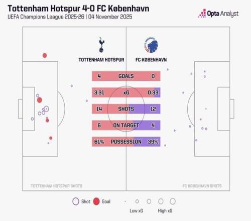 北京时间11月5日欧洲冠军联赛,联赛阶段第4轮,热刺主场4-0击败哥本哈根,热刺的预期进球高达3.31。
