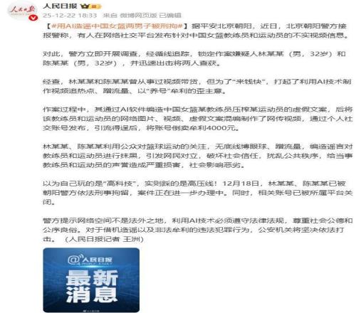 信息来源:原文登载于央视新闻2025年12月22日关于“利用AI造谣“中国女篮”两男子被刑拘”的报道